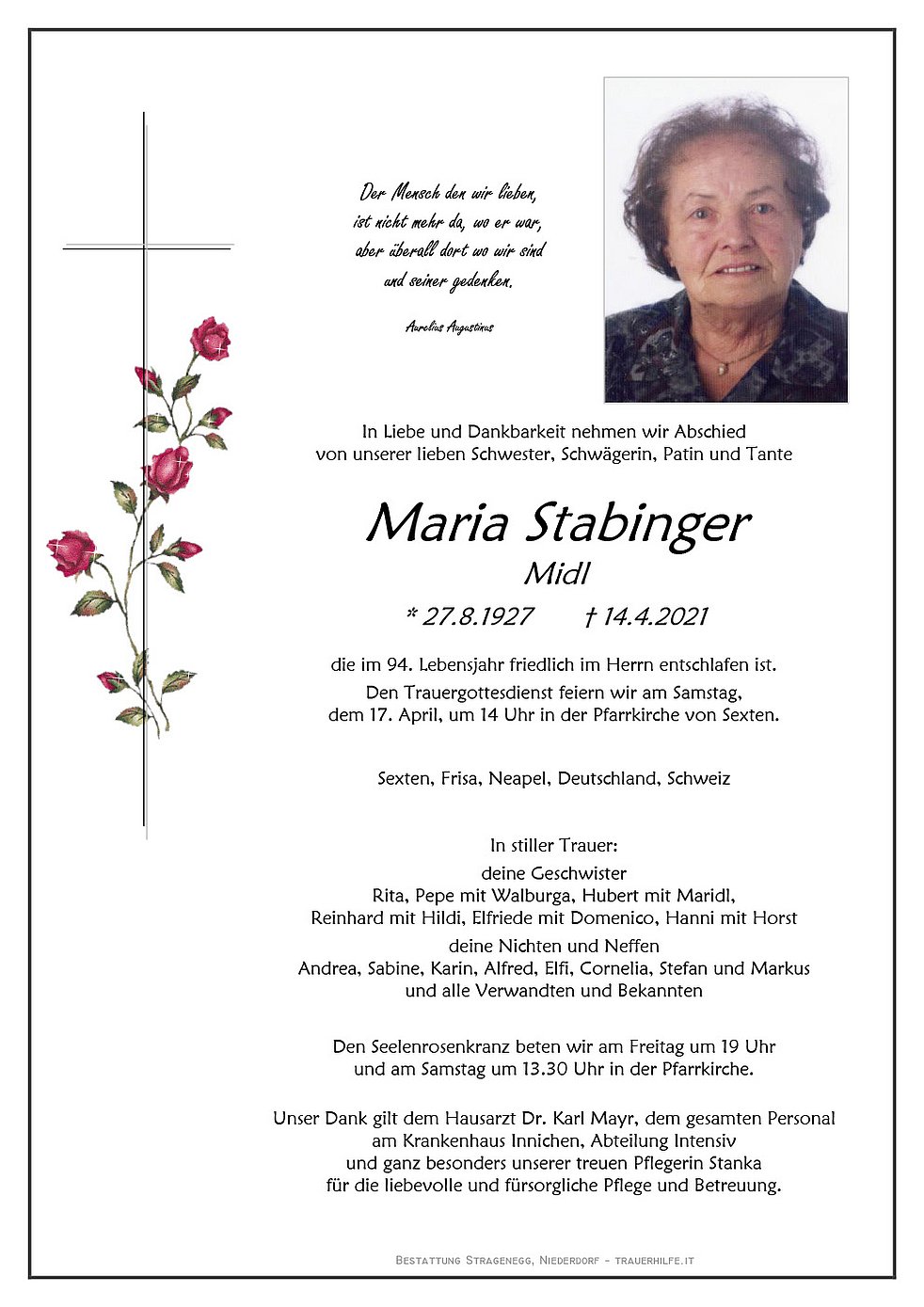 Unser Dank gilt dem Hausarzt Dr. Karl Mayr, dem gesamten Personal am Krankenhaus Innichen, Abteilung Intensiv und ganz besonders unserer treuen Pflegerin Stanka für die liebevolle und fürsorgliche Pflege und Betreuung.