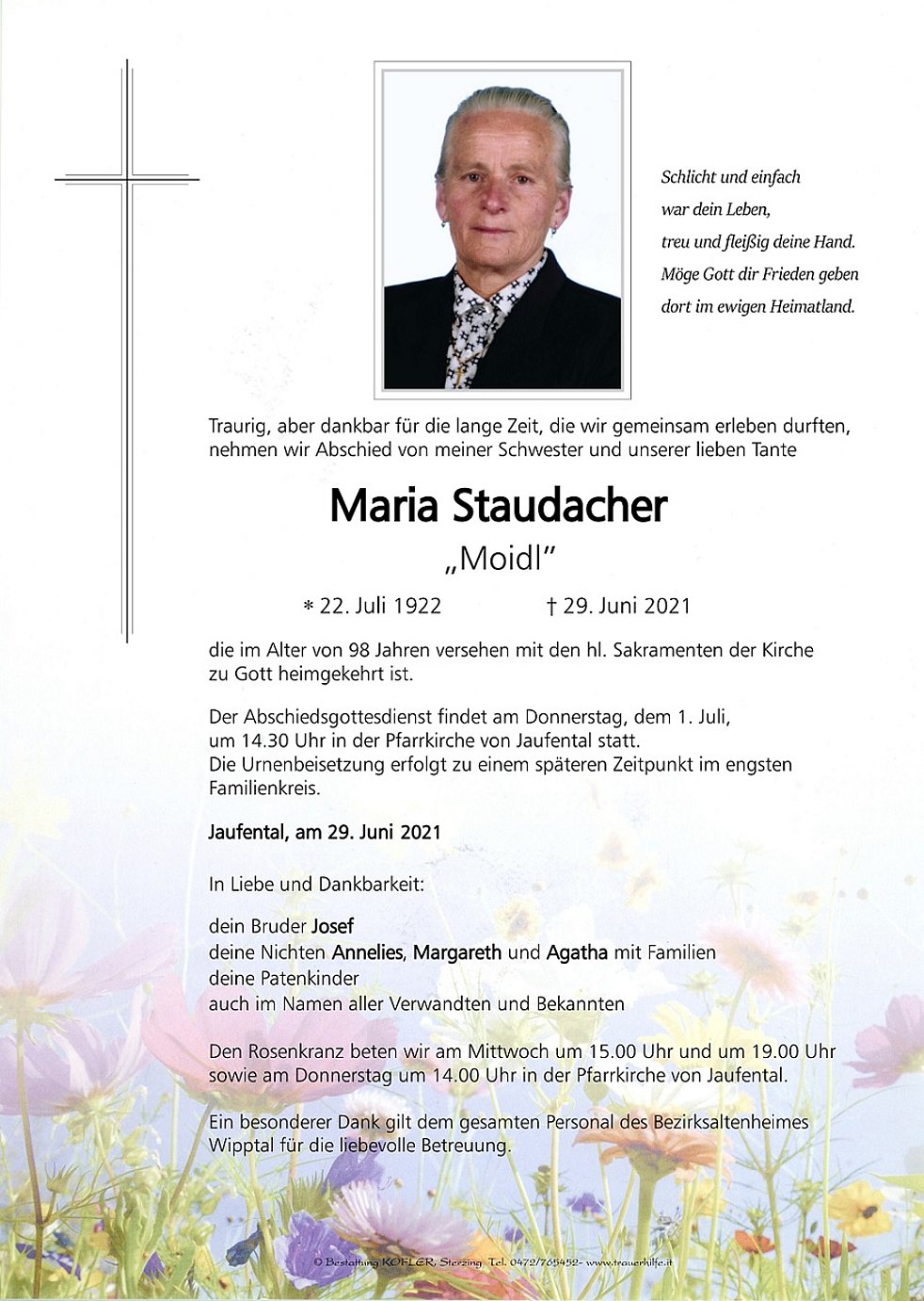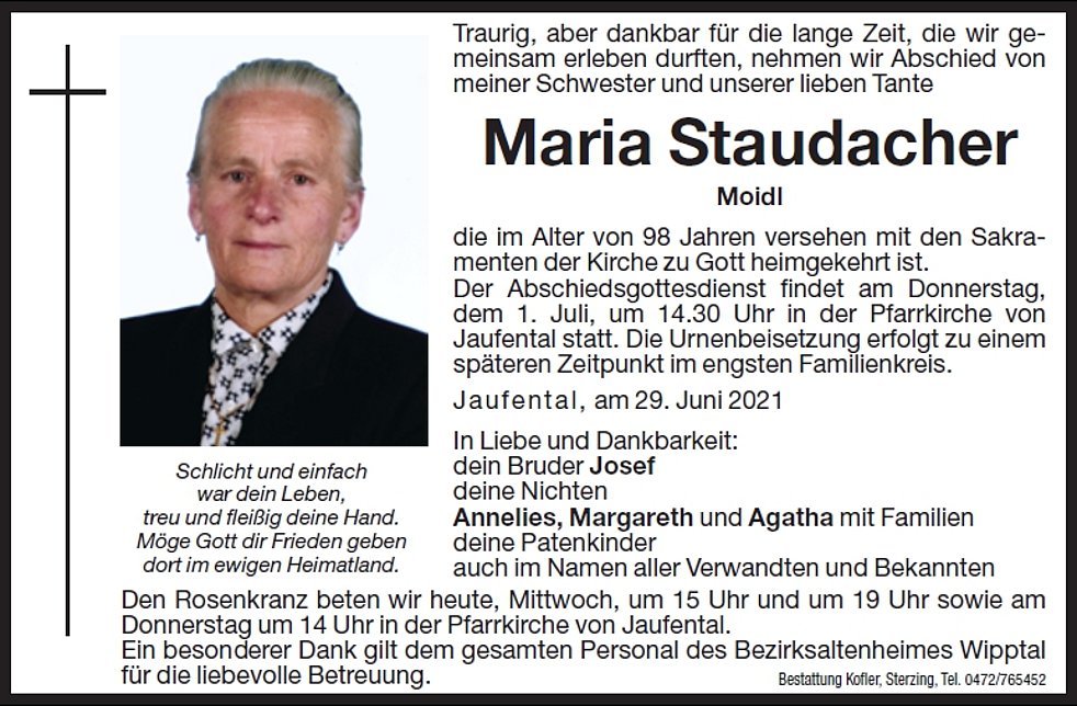 Der Abschiedsgottesdienst findet am Donnerstag, dem 1. Juli, um 14.30 Uhr in der Pfarrkirche von Jaufental statt. Die Urnenbeisetzung erfolgt zu einem späteren Zeitpunkt im engsten Familienkreis.