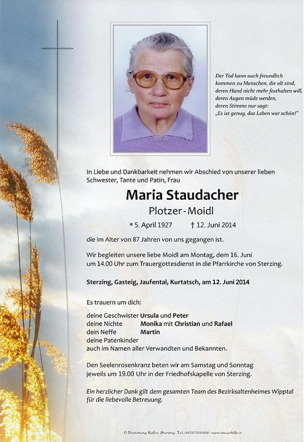 Wir begleiten unsere liebe Moidl am Montag, dem 16. Juni