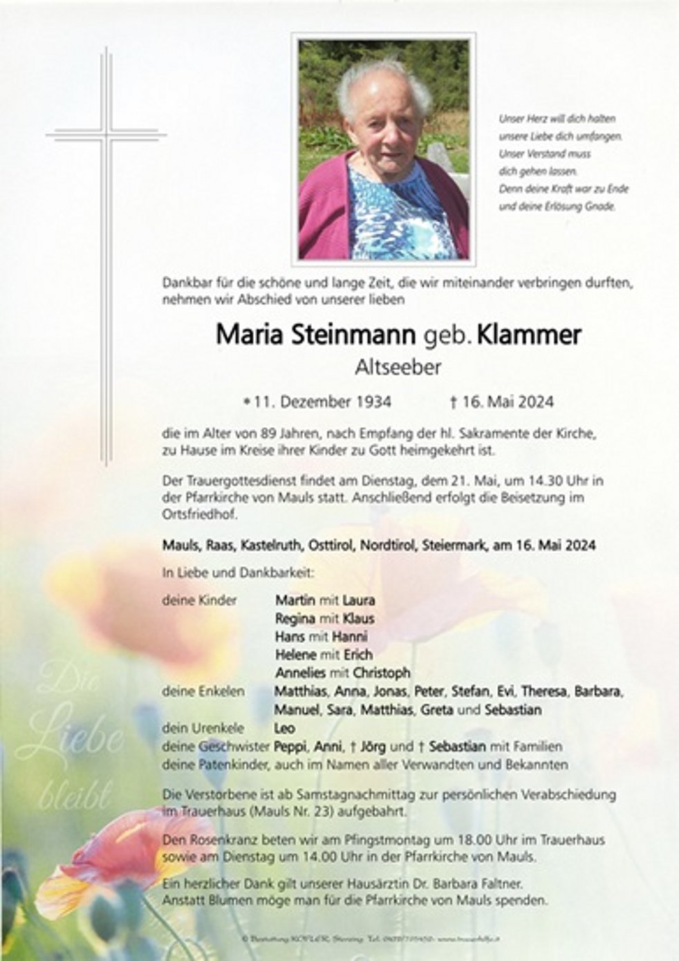 Begräbnisgottesdienst: 21.05. - 14:30 Uhr Pfarrkirche von Mauls