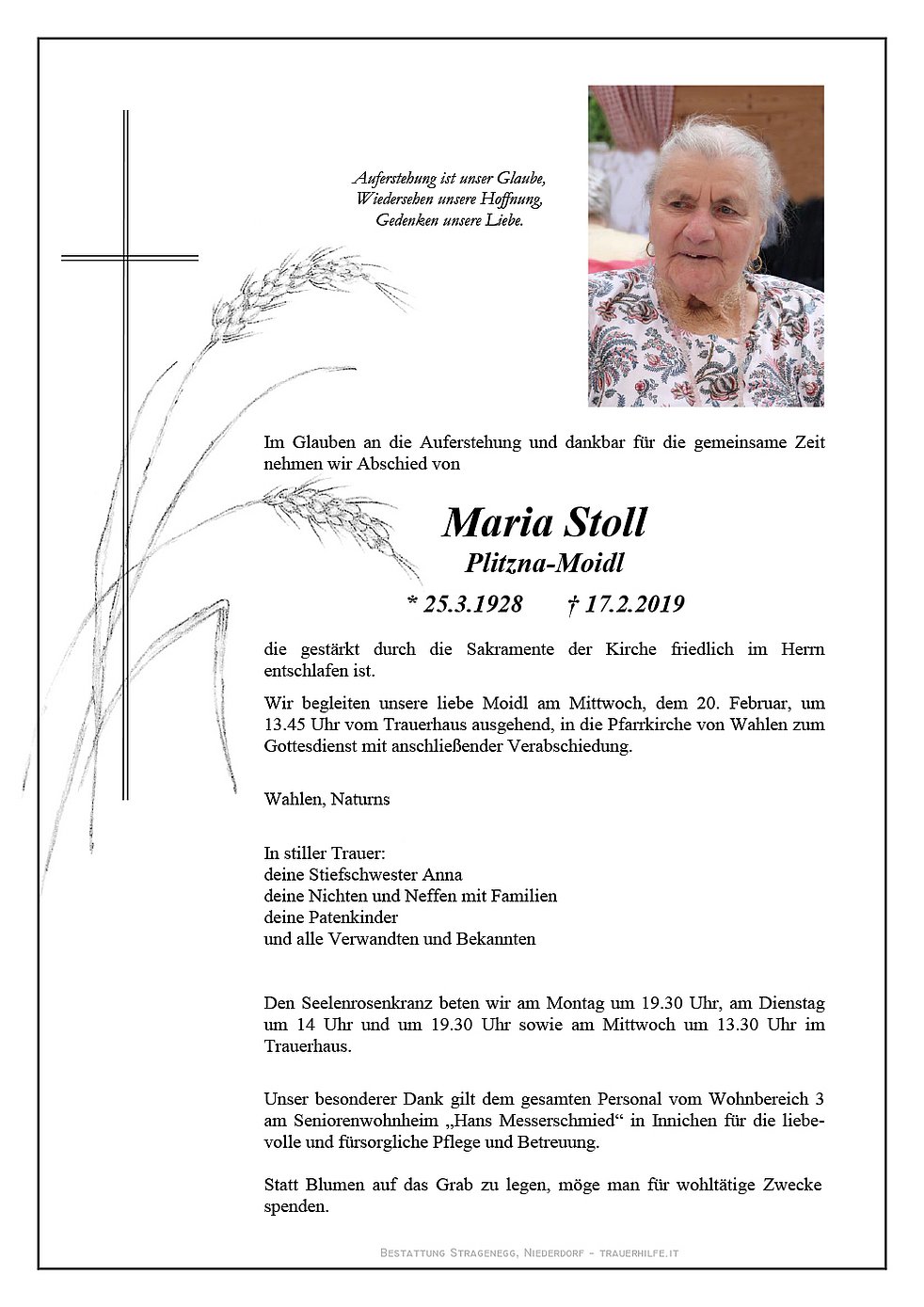 Wir begleiten unsere liebe Moidl am Mittwoch, dem 20. Februar, um 13.45 Uhr vom Trauerhaus ausgehend, in die Pfarrkirche von Wahlen zum Gottesdienst mit anschließender Verabschiedung.