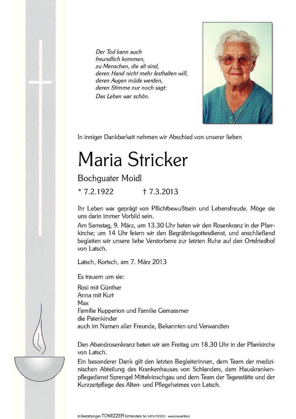 Am Samstag, 9. März, um 13.30 Uhr beten wir den Rosenkranz in der Pfarrkirche; um 14 Uhr feiern wir den Begräbnisgottesdienst, und anschließend begleiten wir unsere liebe Verstorbene zur letzten Ruhe auf den Ortsfriedhof von Latsch.