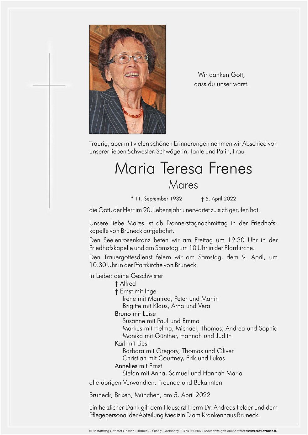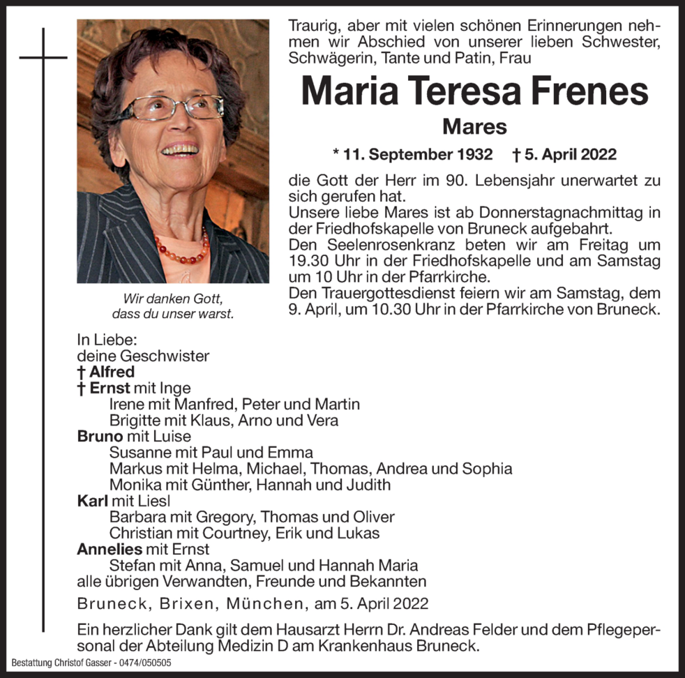 Unsere liebe Mares ist ab Donnerstagnachmittag in der Friedhofskapelle von Bruneck aufgebahrt.