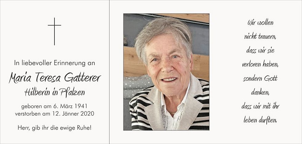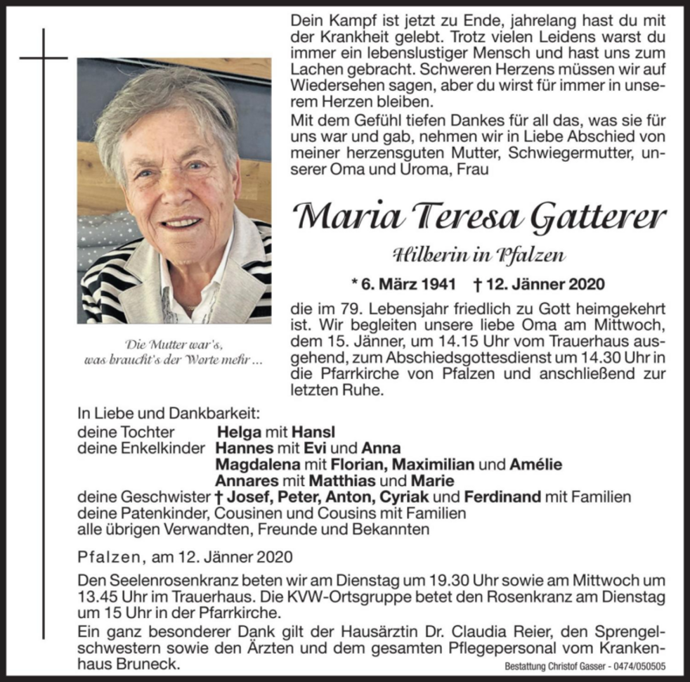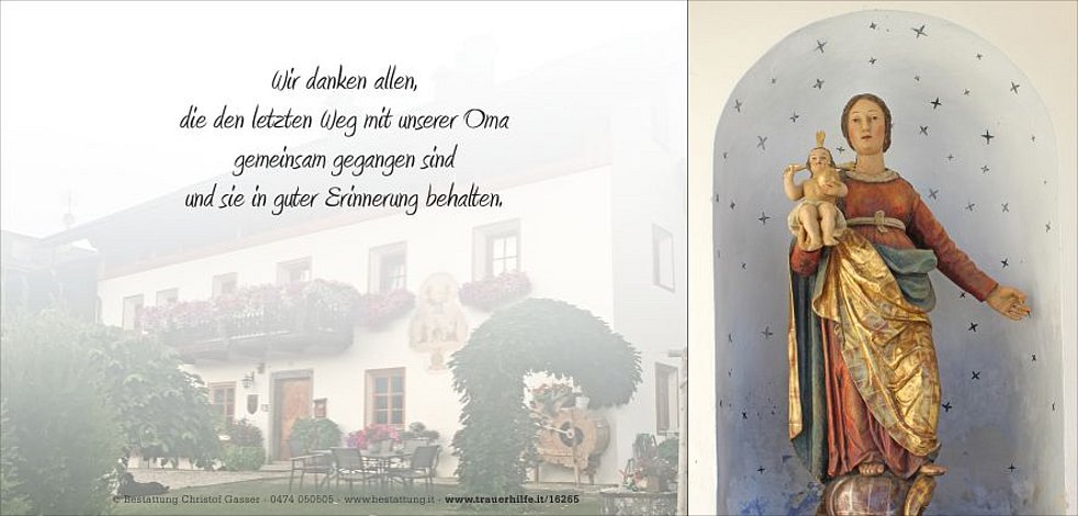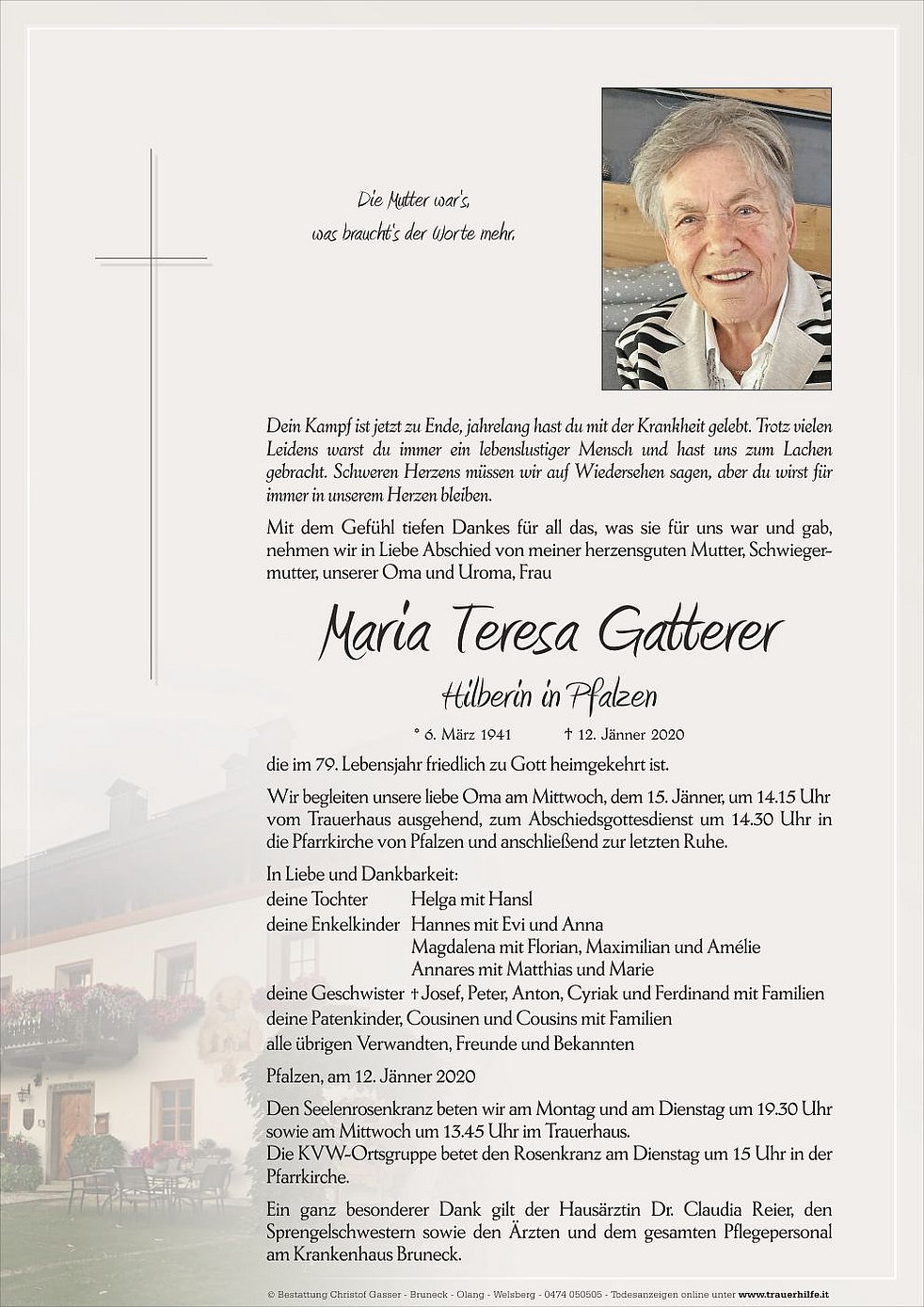 Wir begleiten unsere liebe Oma am Mittwoch, dem 15. Jänner, um 14.15 Uhr vom Trauerhaus ausgehend, zum Abschiedsgottesdienst um 14.30 Uhr in die Pfarrkirche von Pfalzen und anschließend zur letzten Ruhe.