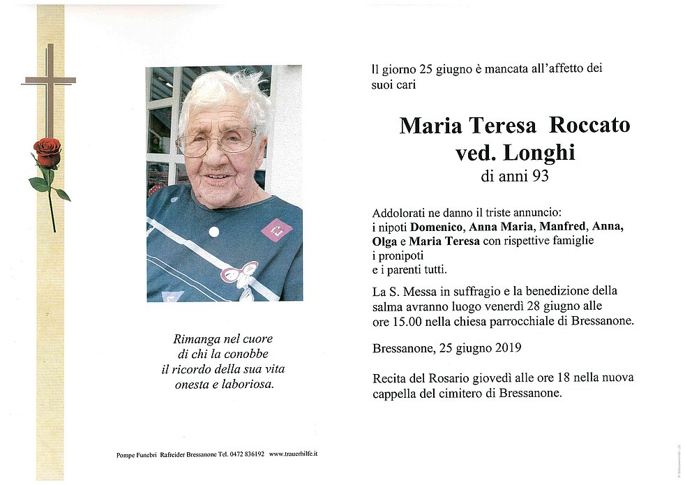 La S. Messa in suffragio e la benedizione della salma avranno luogo venerdì 28 giugno alle ore 15.00 nella chiesa parrocchiale di Bressanone.