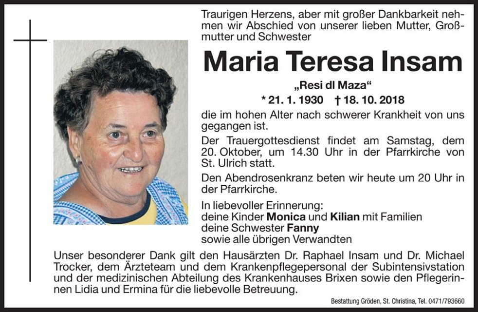 Der Trauergottesdienst findet am Samstag, dem 20. Oktober, um 14.30 Uhr in der Pfarrkirche von St. Ulrich statt.