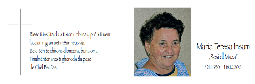 Unser besonderer Dank gilt den Hausärzten Dr. Raphael Insam und Dr. Michael Trocker, dem Ärzteteam und dem Krankenpflegepersonal der Subintensivstation und der medizinischen Abteilung des Krankenhauses Brixen sowie den Pflegerinnen Lidia und Ermina für die liebevolle Betreuung.