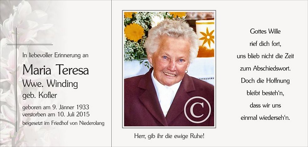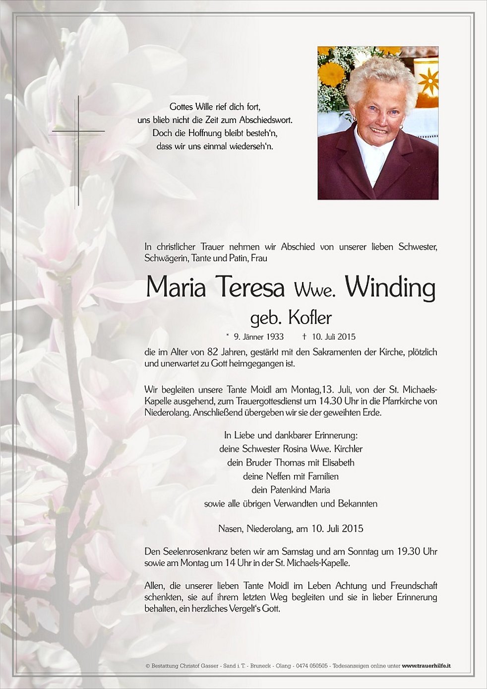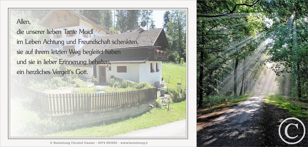 Allen, die unserer lieben Tante Moidl im Leben Achtung und Freundschaft schenkten, sie auf ihrem letzten Weg begleiten und sie in lieber Erinnerung behalten, ein herzliches Vergelt‘s Gott.