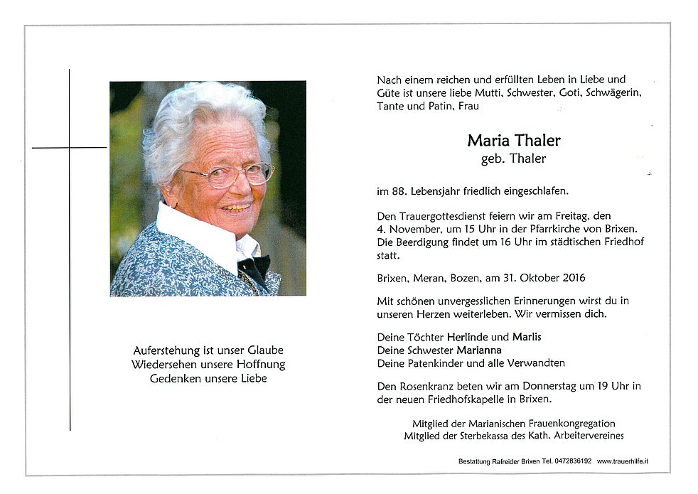 Von Herzen danken wir dem Betreuungsteam des 2. Wohnbereichs im Martinsheim Kastelruth und allen, die am Rosenkranz und an der Beerdigung teilnehmen.