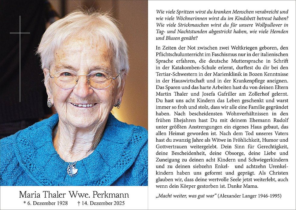Dankbar, dass wir sie so lange unter uns haben durften, verabschieden wir uns in Trauer von unserer Mutter, Schwiegermutter, Großmutter, Urgroßmutter, Schwester, Tante und Patin
