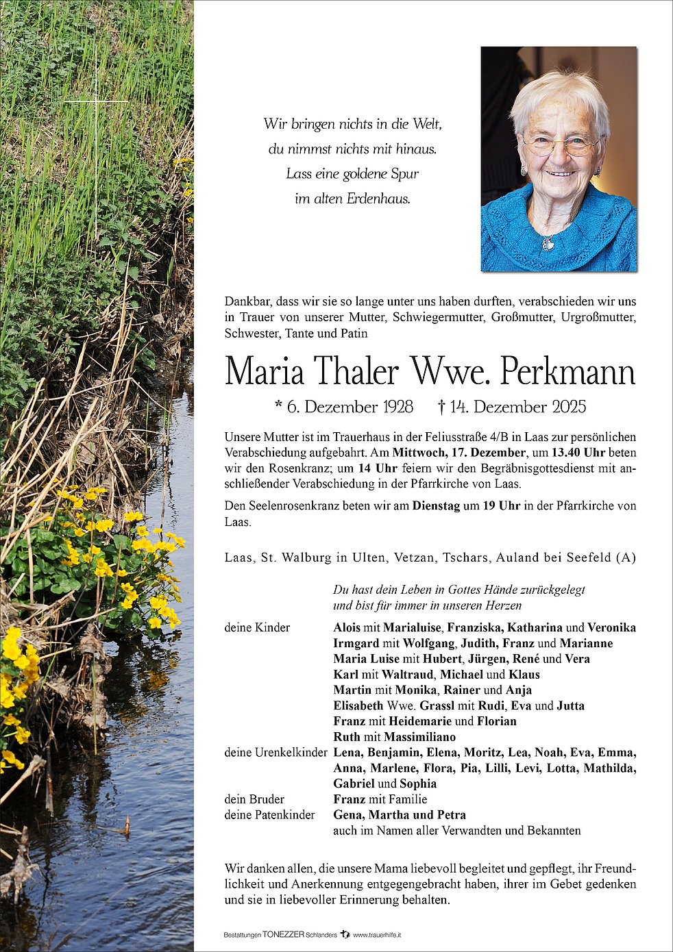 Am Mittwoch, 17. Dezember, um 13.40 Uhr beten wir den Rosenkranz; um 14 Uhr feiern wir den Begräbnisgottesdienst mit anschließender Verabschiedung in der Pfarrkirche von Laas.