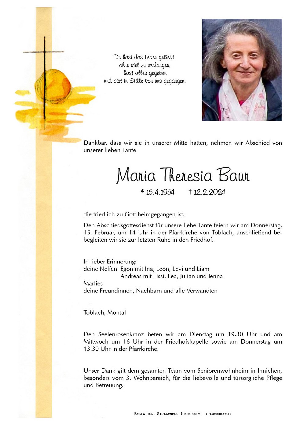 Begräbnisgottesdienst: 15.02. - 14:00 Uhr Toblach