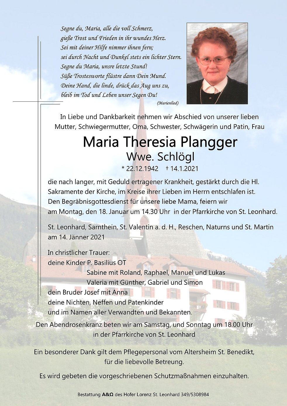 am Montag, den 18. Januar um 14.30 Uhr in der Pfarrkirche von St. Leonhard.