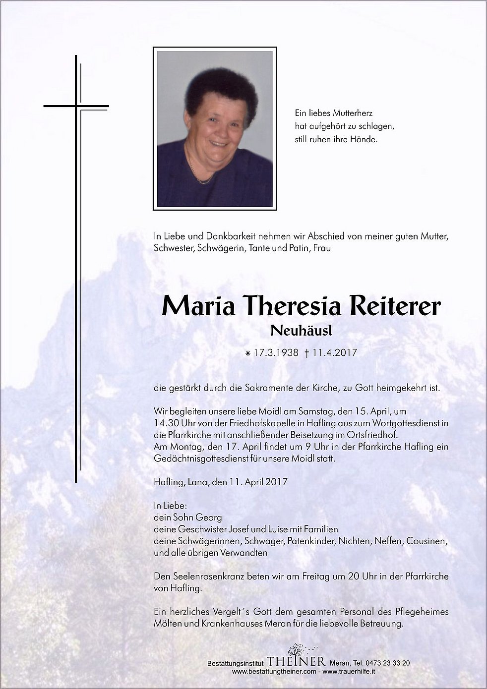Wir begleiten unsere liebe Moidl am Samstag, den 15. April, um 14.30 Uhr von der Friedhofskapelle in Hafling aus zum Wortgottesdienst in die Pfarrkirche mit anschließender Beisetzung im Ortsfriedhof.