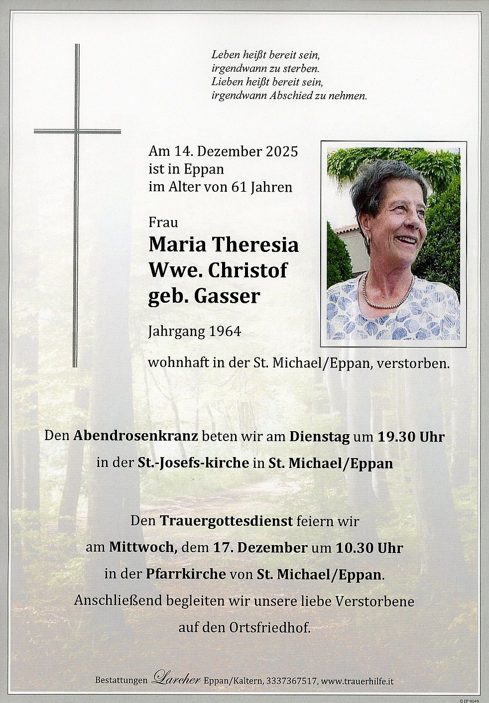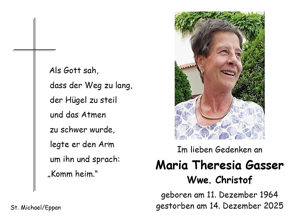 Den Begräbnisgottesdienst feiern wir am Mittwoch, dem 17. Dezember, um 10.30 Uhr in der Pfarrkirche von St. Michael/Eppan. Anschließend begleiten wir unsere liebe Verstorbene auf den Ortsfriedhof.