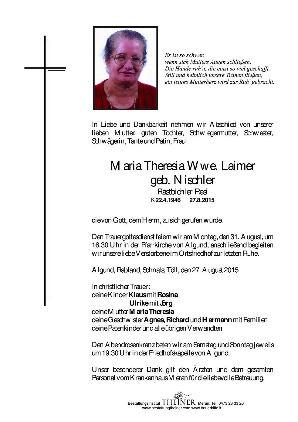 ich möchte euch mein Beileid ausdrücken ,eure Mutter ist von uns gegangen aber in unseren Herzen wird ihr lachen ,ihre Witze ihre Fröhlichkeit immer bleiben, meine Gedanken sind immer bei dem Lied vom Gabalie "Oanmol sgn mir ins wieder"des sicher a zuatreffen wird. Somit liebe Rostbichler Tresl ruhe in Frieden Ulrike Innerhofer von Marlinger Berg