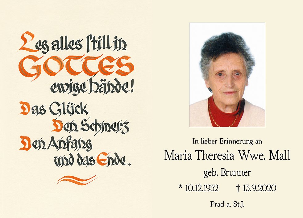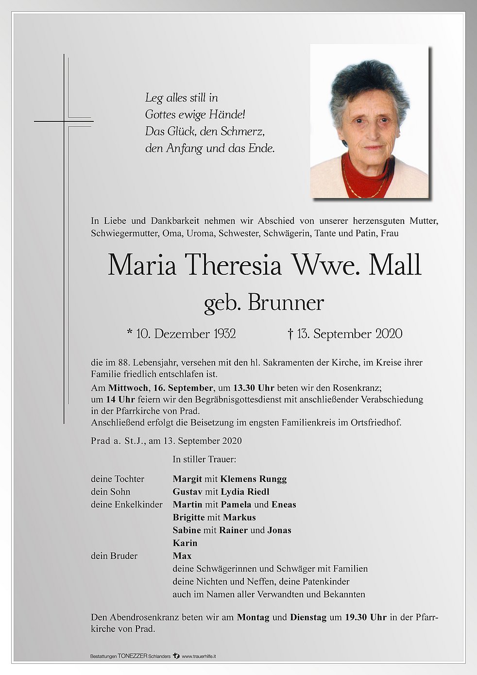 Am Mittwoch, 16. September, um 13.30 Uhr beten wir den Rosenkranz; um 14 Uhr feiern wir den Begräbnisgottesdienst mit anschließender Verabschiedung in der Pfarrkirche von Prad.