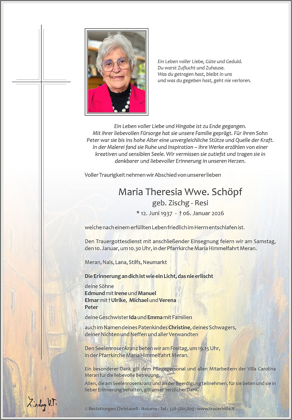 Den Trauergottesdienst mit anschließender Einsegnung feiern wir am Samstag, den 10. Januar, um 10.30 Uhr, in der Pfarrkirche Maria Himmelfahrt Meran.