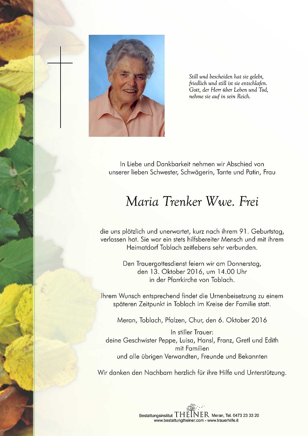 Den Trauergottesdienst feiern wir am Donnerstag, den 13. Oktober 2016, um 14.00 Uhr in der Pfarrkirche von Toblach.