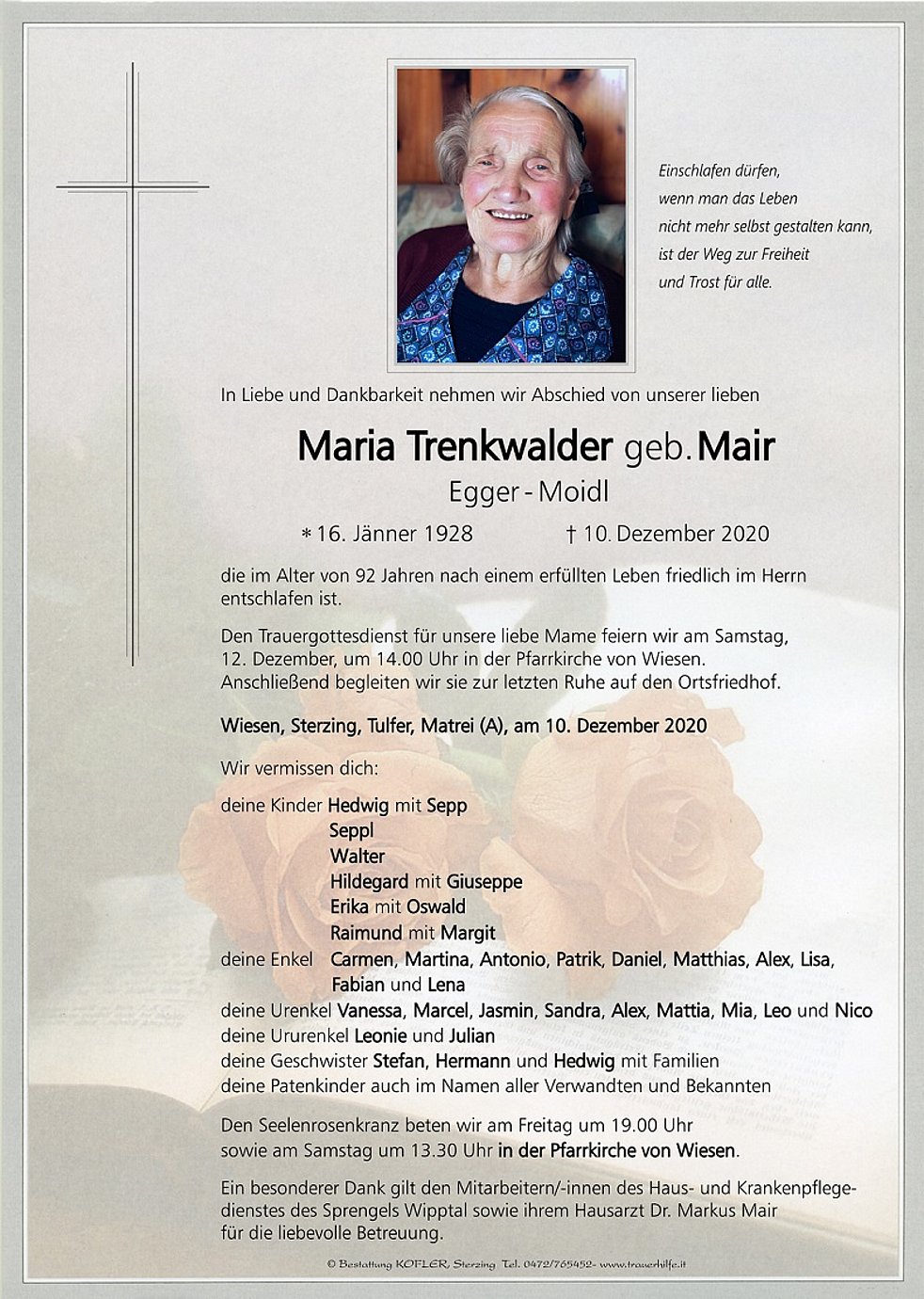 Ein besonderer Dank gilt den Mitarbeitern/-innen des Haus- und Krankenpflegedienstes des Sprengels Wipptal sowie ihrem Hausarzt Dr. Markus Mair für die liebevolle Betreuung.