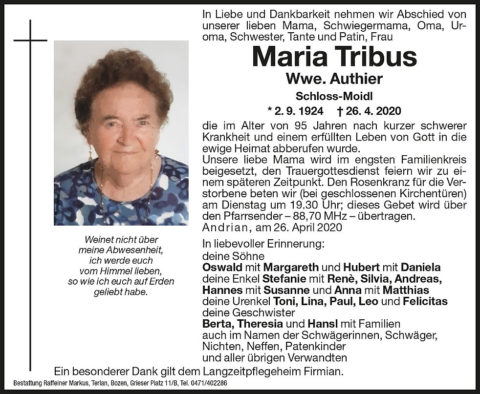 Den Rosenkranz für die Verstorbene beten wir (bei geschlossenen Kirchtüren) am Dienstag um 19.30 Uhr; dieses Gebet wird über den Pfarrsender - 88,70 Mhz – übertragen.