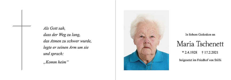 Am Montag, 22. Februar, um 13.30 Uhr beten wir den Rosenkranz; um 14 Uhr feiern wir den Begräbnisgottesdienst in der Pfarrkirche von Stilfs; anschließend erfolgt die Beisetzung im Ortsfriedhof.