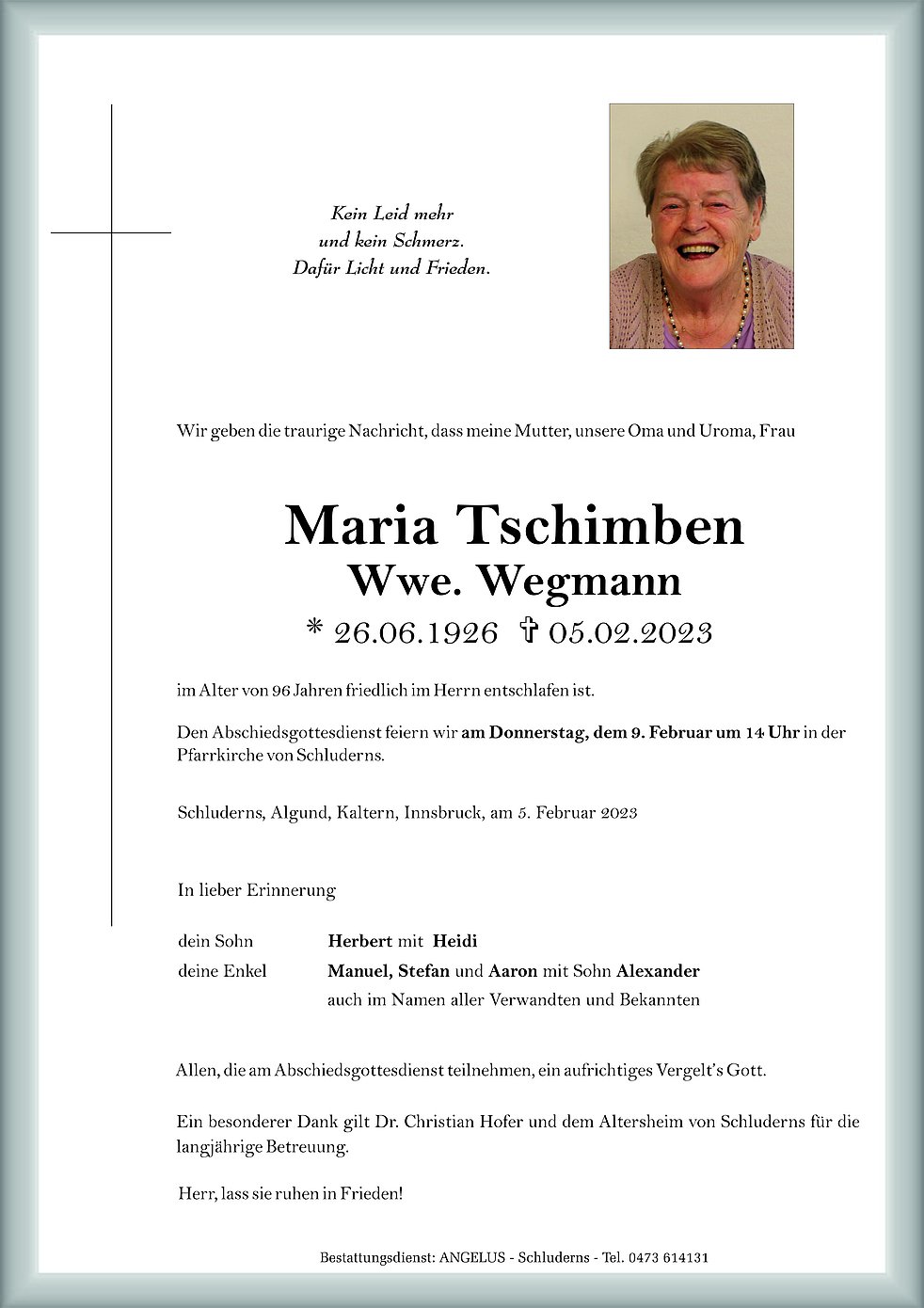 Trauerfeier: 09.02. - 14:00 Uhr Pfarrkirche von Schluderns