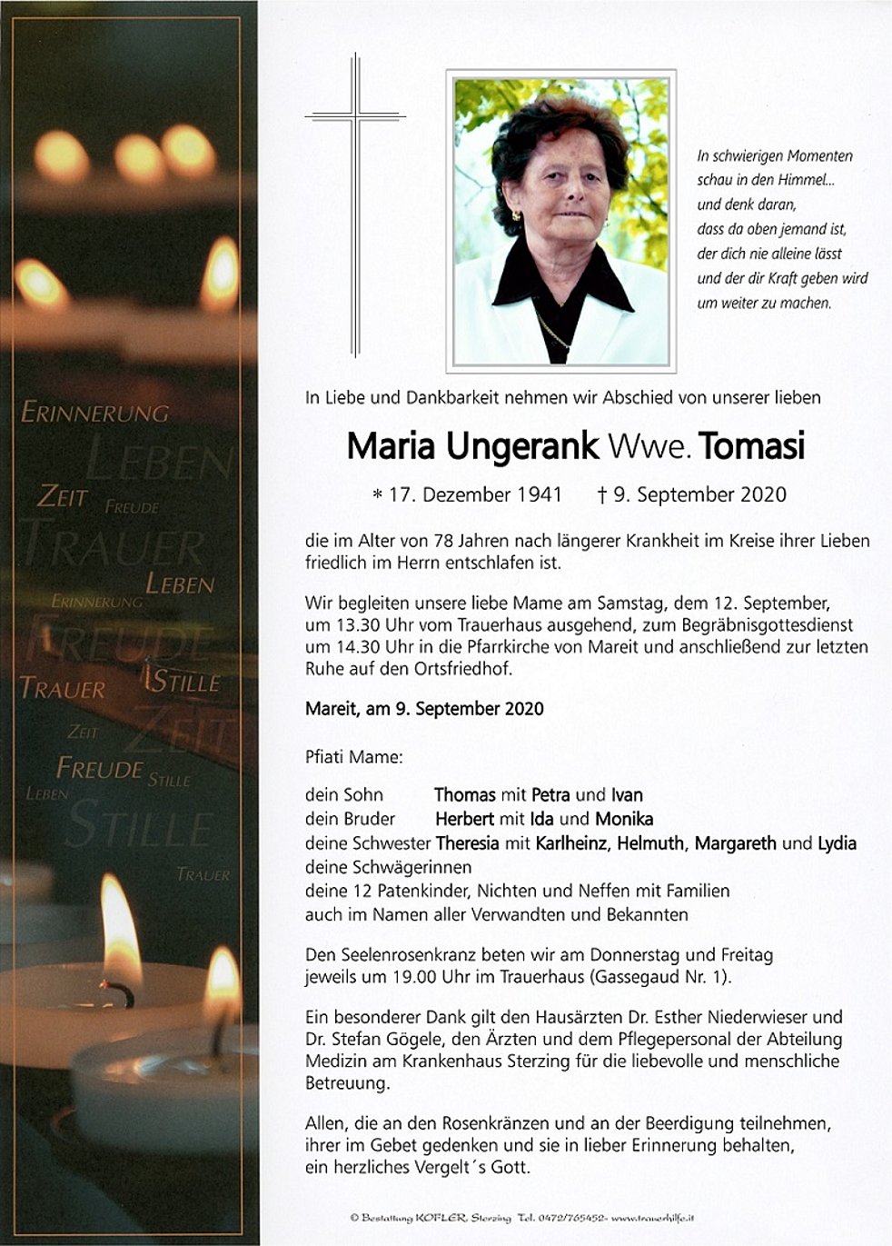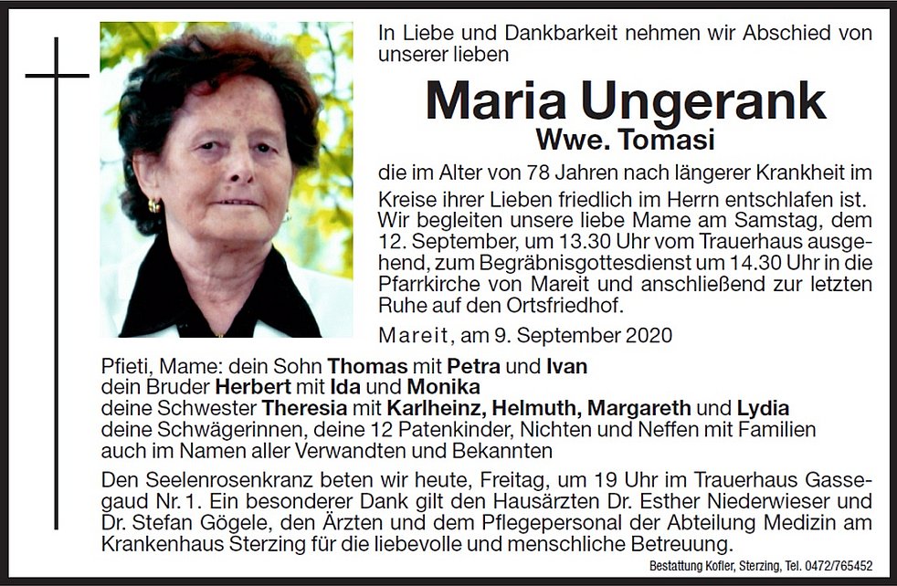 Wir begleiten unsere liebe Mame am Samstag, dem 12. September, um 13.30 Uhr vom Trauerhaus ausgehend, zum Begräbnisgottesdienst um 14.30 Uhr in die Pfarrkirche von Mareit und anschließend zur letzten Ruhe auf den Ortsfriedhof.