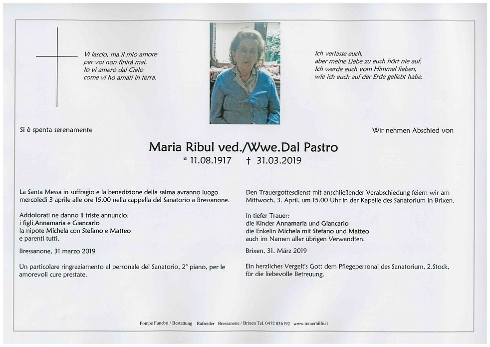 La Santa Messa in suffragio e la benedizione della salma avranno luogo mercoledì 3 aprile alle ore 15.00 nella cappella del Sanatorio a Bressanone.