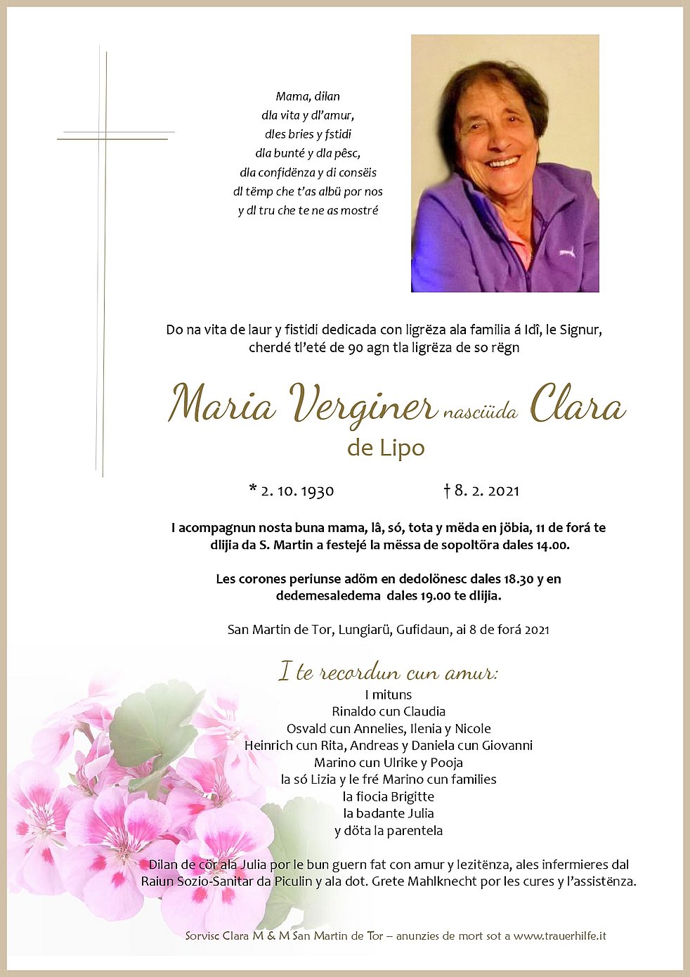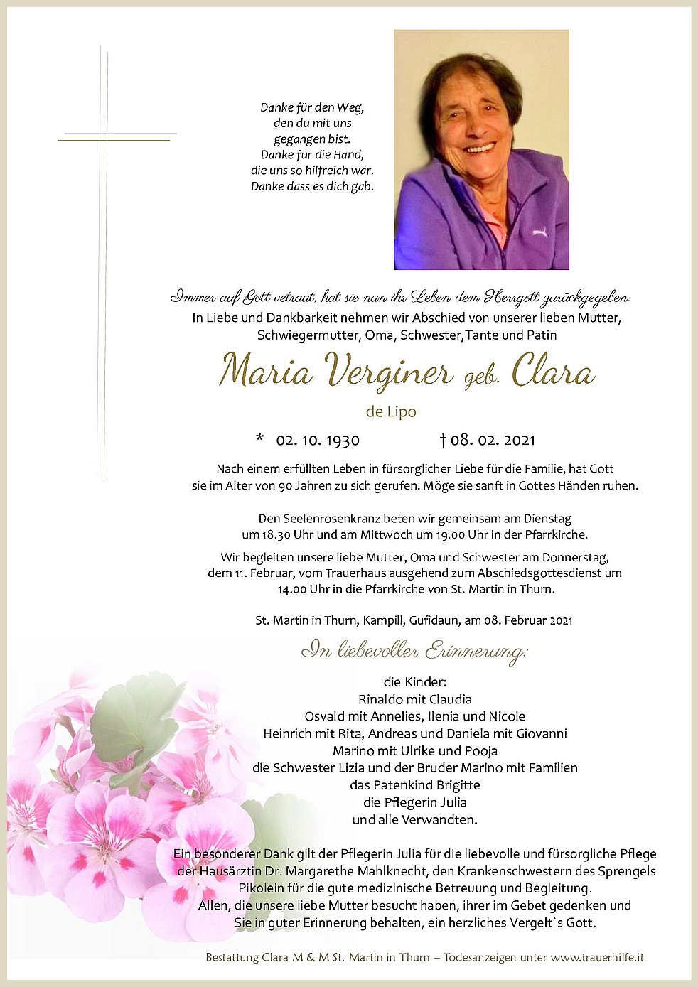 Wir begleiten unsere liebe Mutter, Oma und Schwester am Donnerstag, dem 11. Februar, vom Trauerhaus ausgehend zum Abschiedsgottesdienst um 14.00 Uhr in die Pfarrkirche von St. Martin in Thurn.