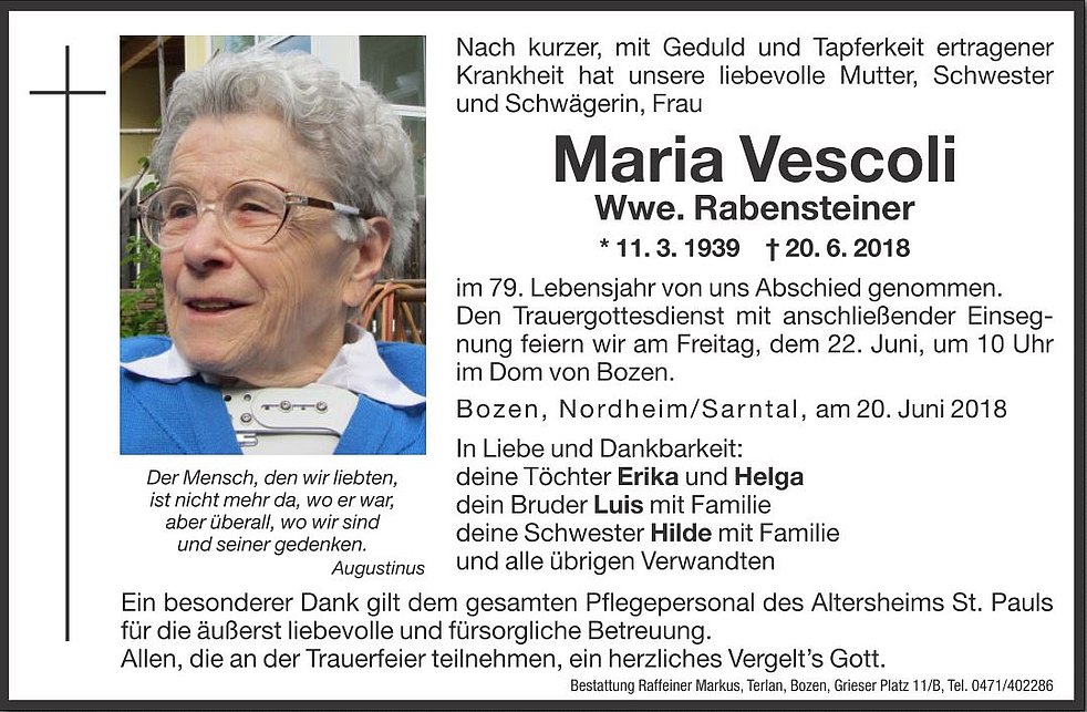 Den Trauergottesdienst mit anschließender Einsegnung feiern wir am Freitag, dem 22. Juni, um 10 Uhr im Dom von Bozen.