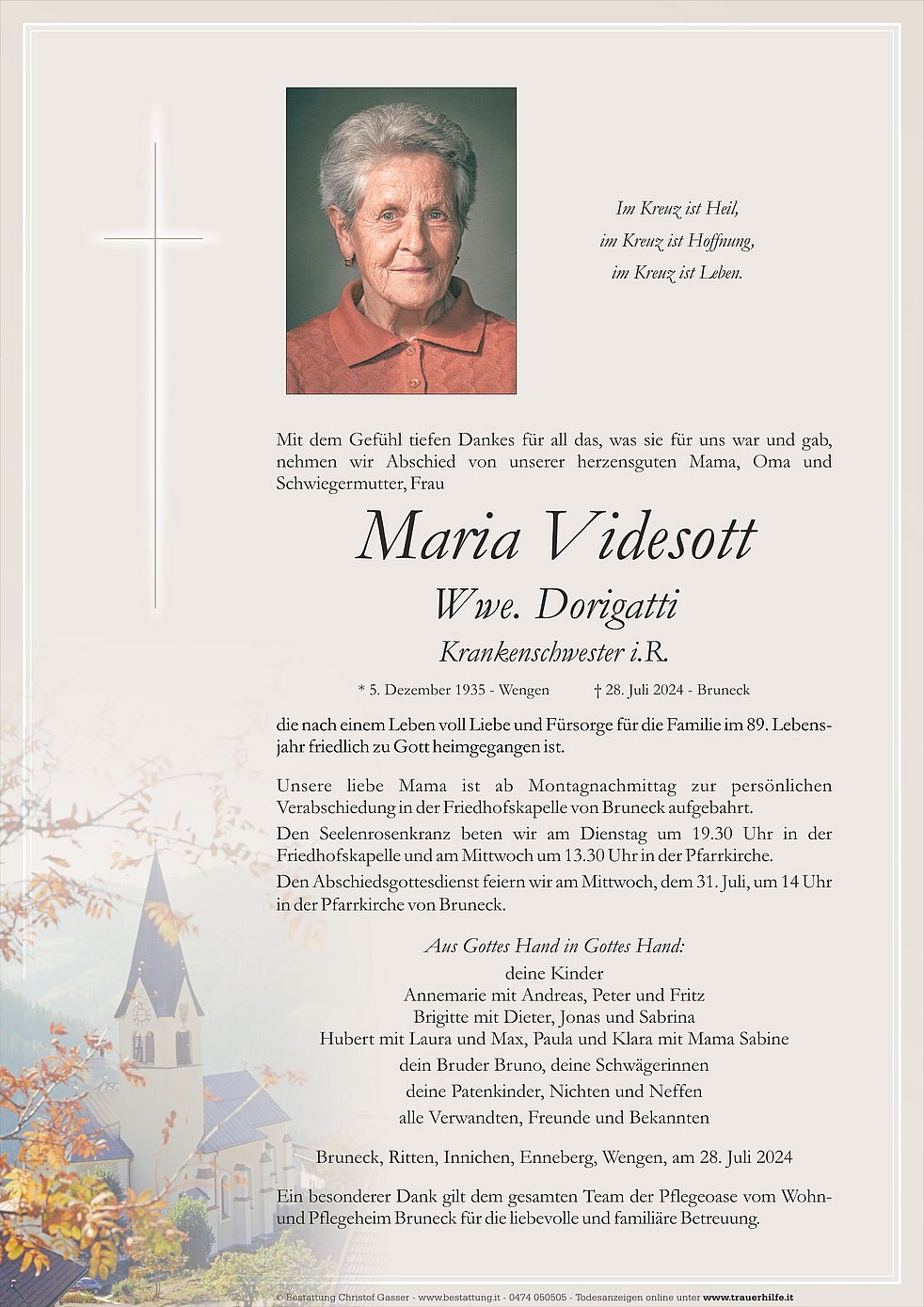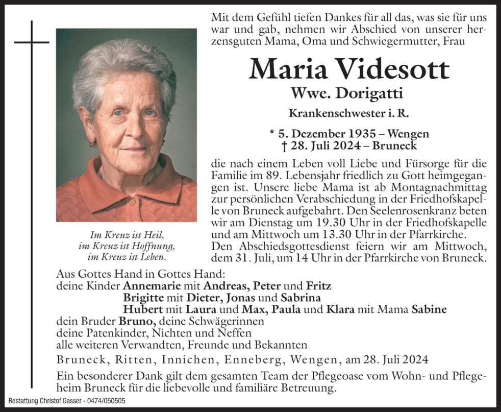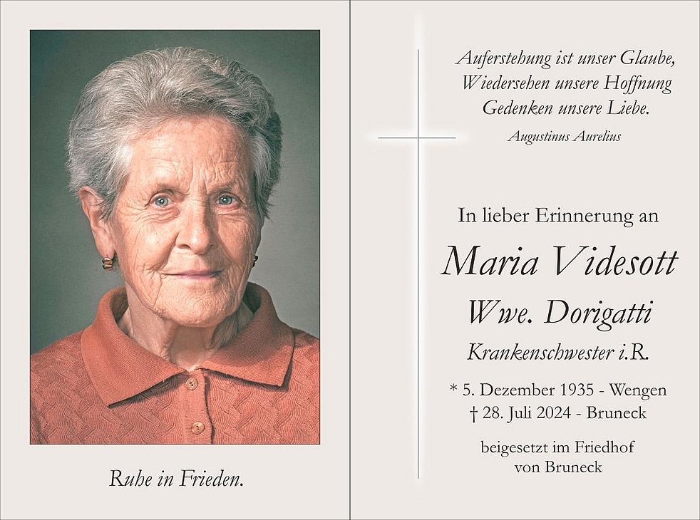 Unsere liebe Mama ist ab Montagnachmittag zur persönlichen Verabschiedung in der Friedhofskapelle von Bruneck aufgebahrt.