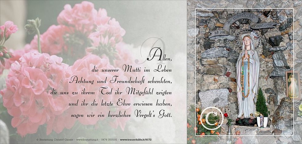 Ein besonderer Dank gilt der Hausärztin Frau Dr. Waltraut Auer, Frau Dr. Siglinde Lanzinger von der Neurologie am Krankenhaus Bruneck, dem Hauspflegedienst sowie gesamten Personal vom Altersheim St. Josef für die liebevolle Betreuung und Begleitung.
