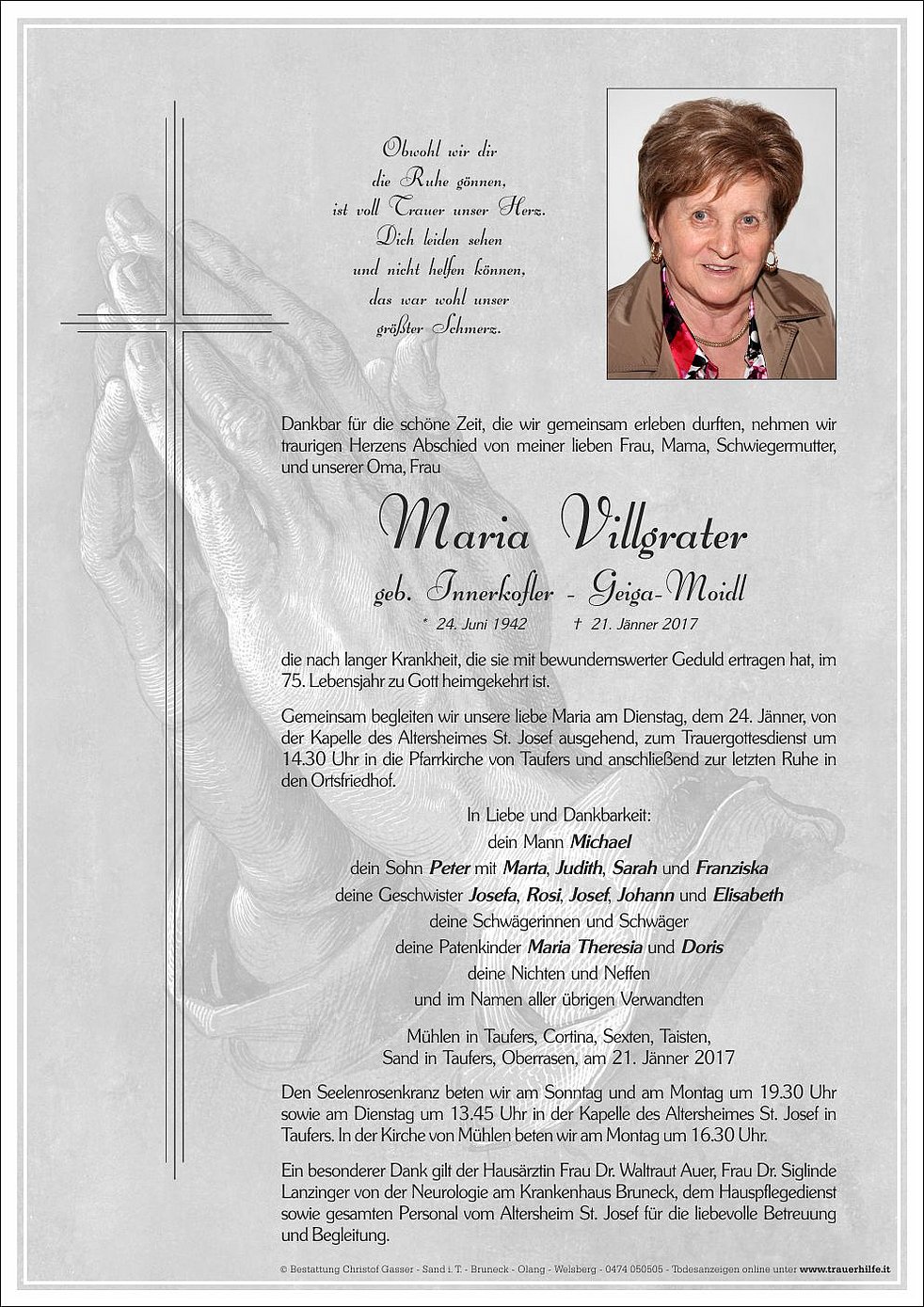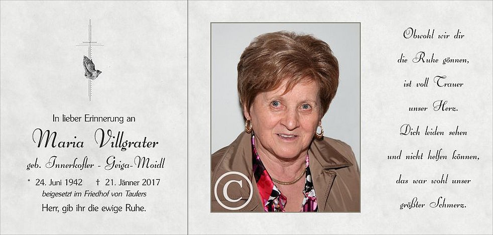 Gemeinsam begleiten wir unsere liebe Maria am Dienstag, dem 24. Jänner, von der Kapelle des Altersheimes St. Josef ausgehend, zum Trauergottesdienst um 14.30 Uhr in die Pfarrkirche von Taufers und anschließend zur letzten Ruhe in den Ortsfriedhof.