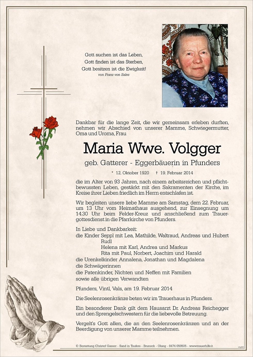 Vergelt’s Gott allen, die an der Beerdigung von unserer lieben Maria teilnehmen, ihrer im Gebet gedenken und sie in guter Erinnerung behalten.