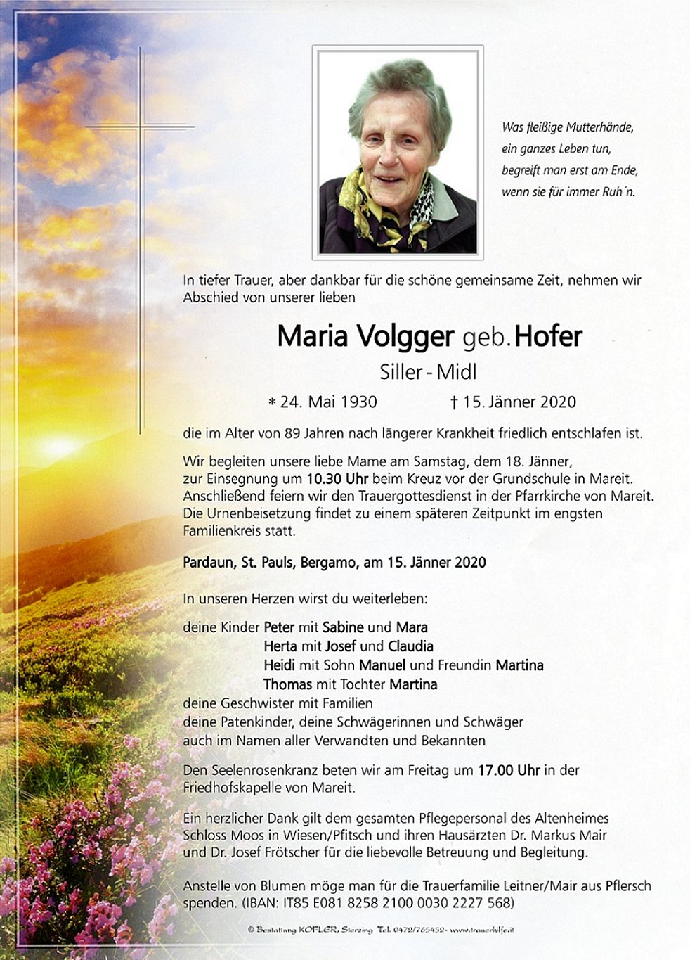 Anstelle von Blumen möge man für die Trauerfamilie Leitner/Mair aus Pflersch spenden. (IBAN: IT85 E081 8258 2100 0030 2227 568)
