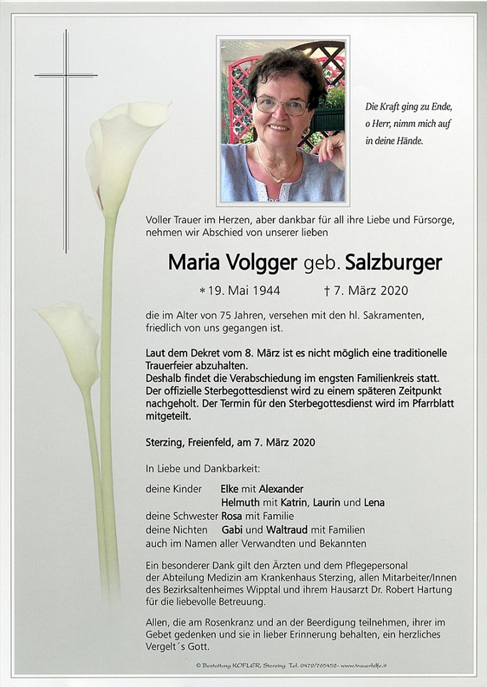 Ein besonderer Dank gilt den Ärzten und dem Pflegepersonal der Abteilung Medizin am Krankenhaus Sterzing, allen Mitarbeiter/Innen des Bezirksaltenheimes Wipptal und ihrem Hausarzt Dr. Robert Hartung für die liebevolle Betreuung.