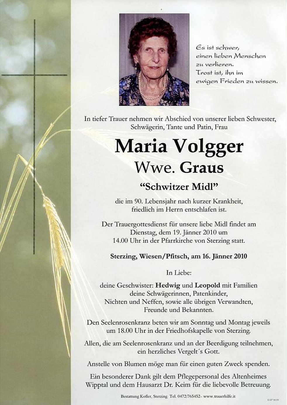 Der Trauergottesdienst für unsere liebe Midl findet am Dienstag, dem 19. Jänner 2010 um 14.00 Uhr in der Pfarrkirche von Sterzing statt.