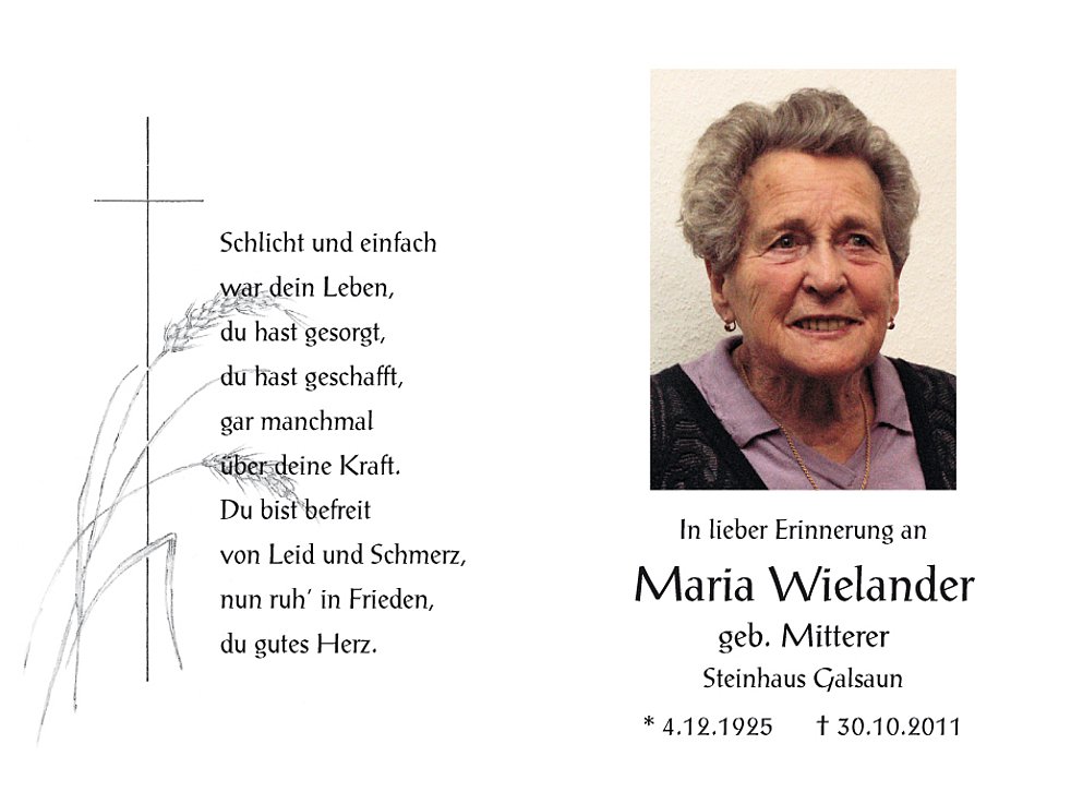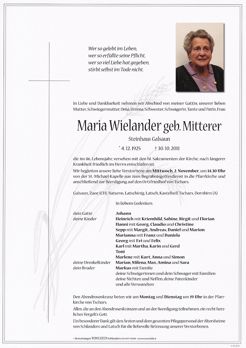 Wir begleiten unsere liebe Verstorbene am Mittwoch, 2. November, um 14.30 Uhr von der St.-Michael-Kapelle aus zum Begräbnisgottesdienst in die Pfarrkirche und anschließend zur Beerdigung auf den Ortsfriedhof von Tschars.