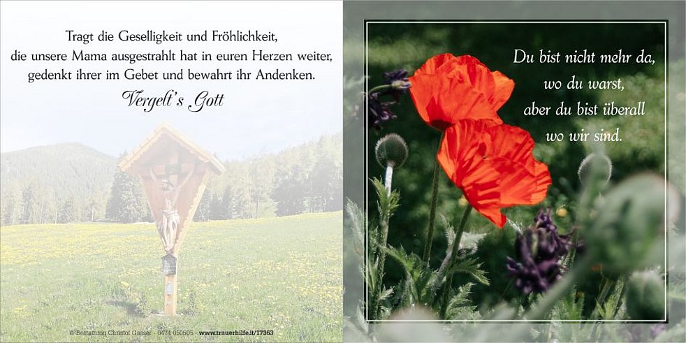 Fassungslos und zutiefst traurig, aber dankbar für alles, was sie uns gegeben hat an Liebe, Güte und Fürsorge nehmen wir Abschied von meiner lieben Frau, unserer Mama, Schwiegermutter und Oma