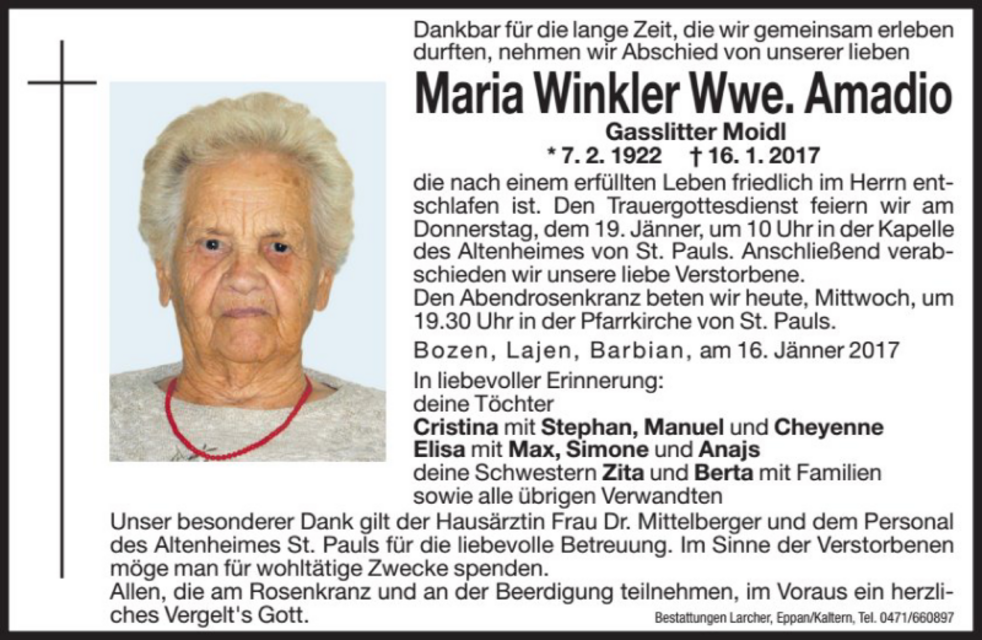 Unser besonderer Dank gilt der Hausärztin Frau Dr. Mittelberger und dem Personal des Altenheimes St. Pauls für die liebevolle Betreuung.