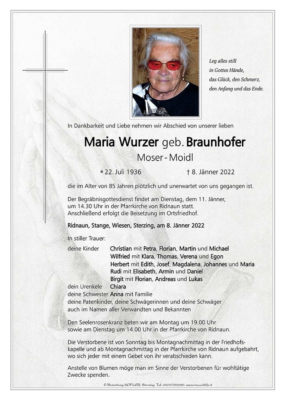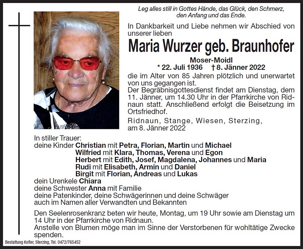 Der Begräbnisgottesdienst findet am Dienstag, dem 11. Jänner, um 14.30 Uhr in der Pfarrkirche von Ridnaun statt. Anschließend erfolgt die Beisetzung im Ortsfriedhof.