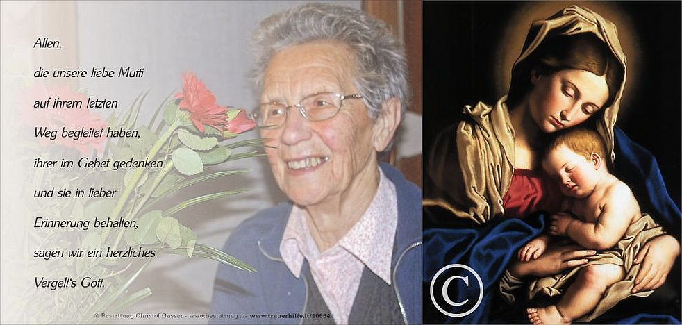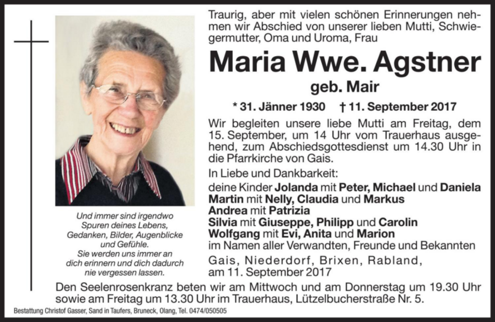 Wir begleiten unsere liebe Mutti am Freitag, dem 15. September, um 14 Uhr vom Trauerhaus ausgehend, auf ihrem letzten Weg zum Abschiedsgottesdienst um 14.30 Uhr in die Pfarrkirche von Gais und anschließend zur letzten Ruhe.