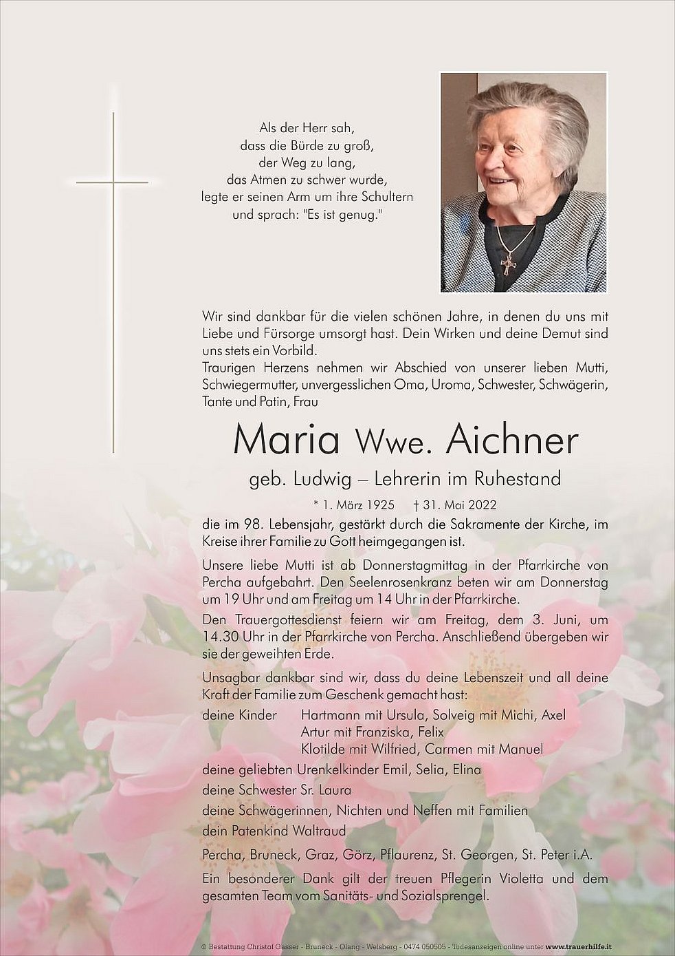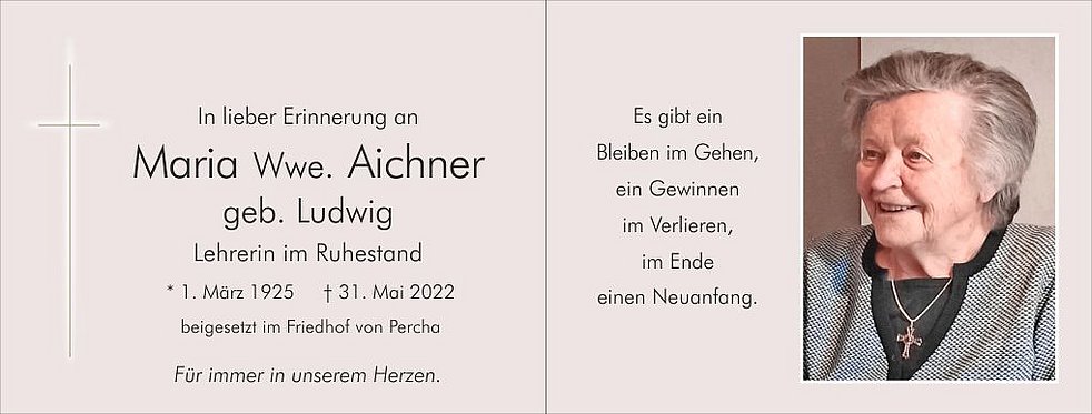 Den Trauergottesdienst feiern wir am Freitag, dem 3. Juni, um 14.30 Uhr in der Pfarrkirche von Percha. Anschließend übergeben wir sie der geweihten Erde.