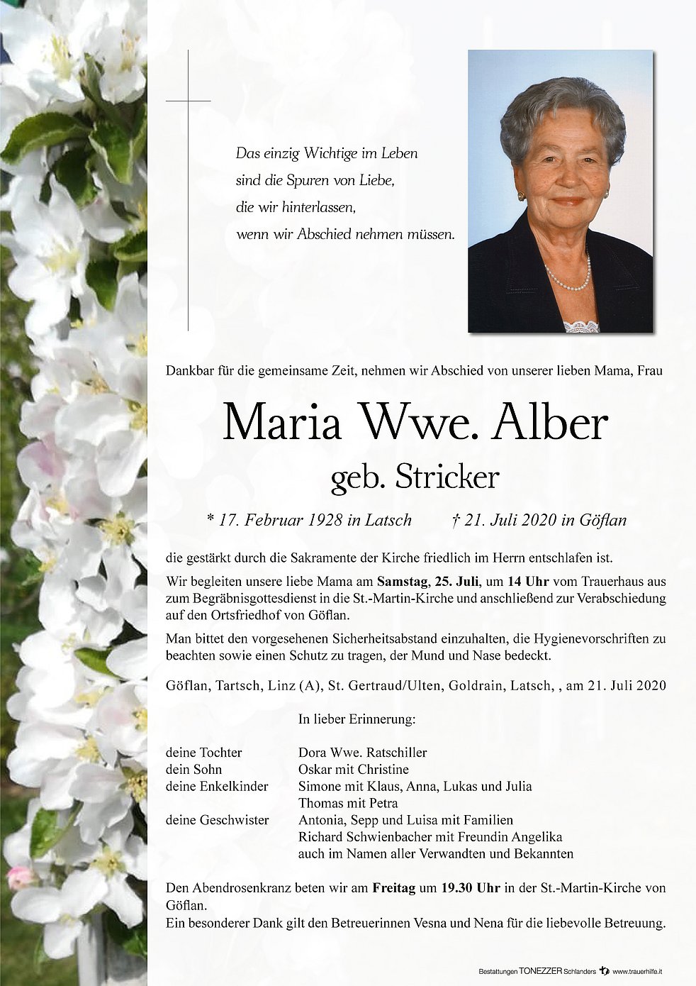 Wir begleiten unsere liebe Mama am Samstag, 25. Juli, um 14 Uhr vom Trauerhaus aus zum Begräbnisgottesdienst in die St.-Martin-Kirche und anschließend zur Verabschiedung auf den Ortsfriedhof von Göflan.