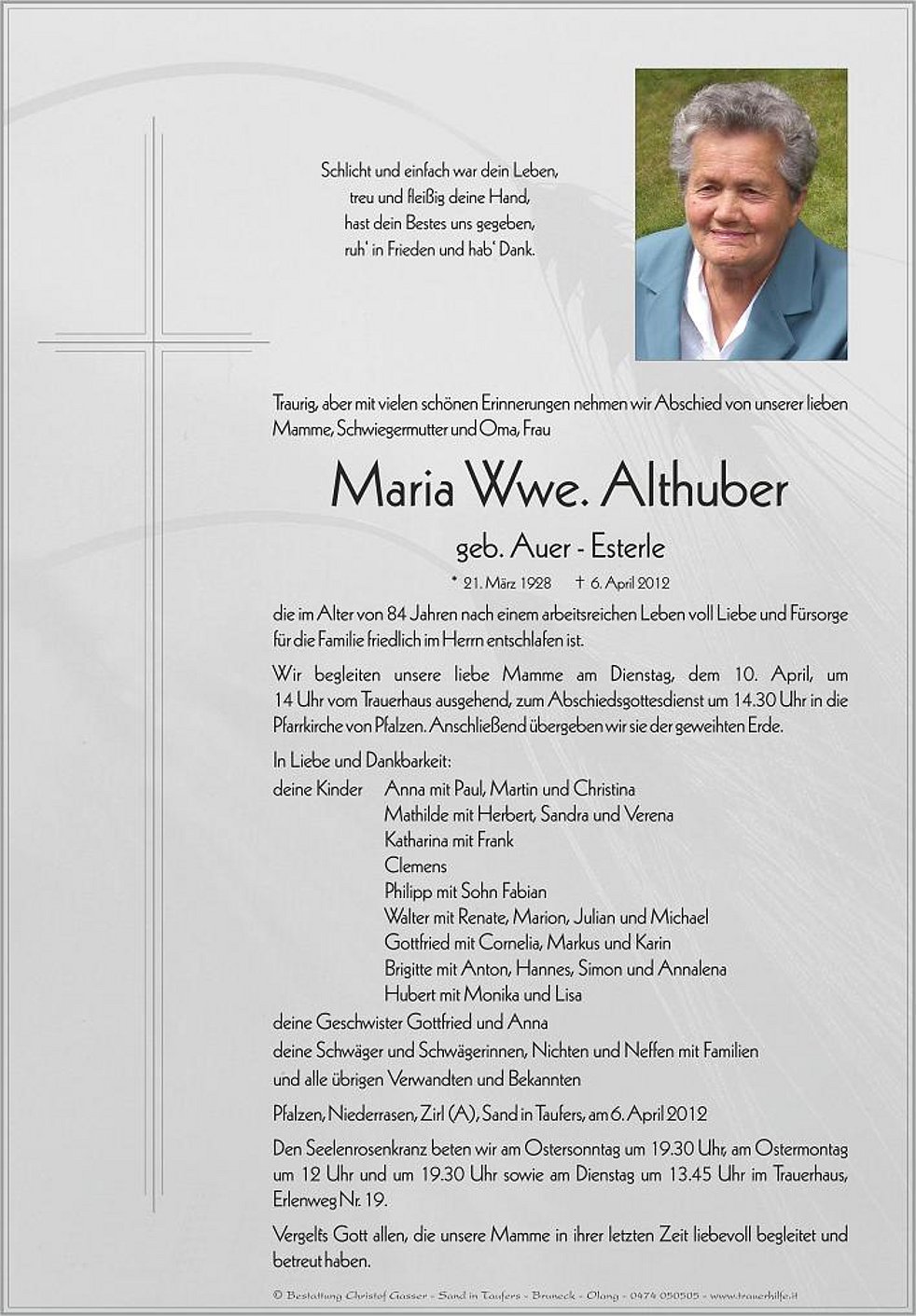 14 Uhr vom Trauerhaus ausgehend, zum Abschiedsgottesdienst um 14.30 Uhr in die Pfarrkirche von Pfalzen. Anschließend übergeben wir sie der geweihten Erde.