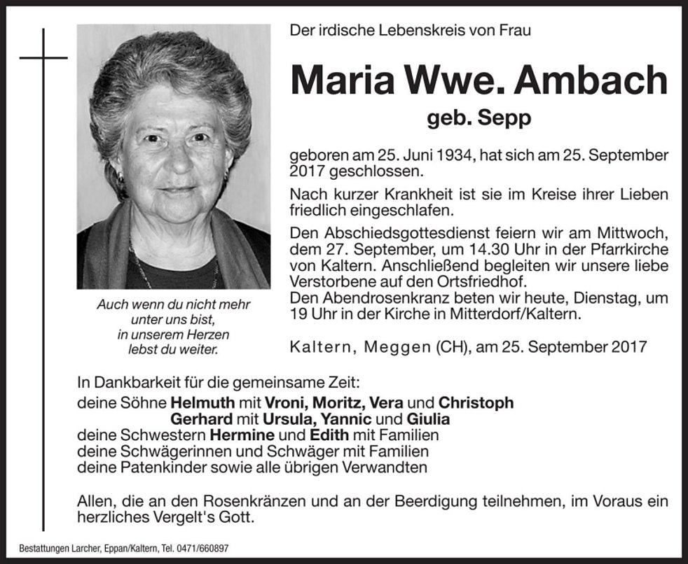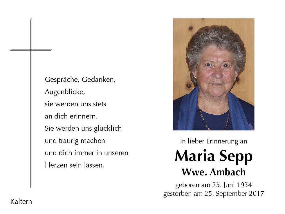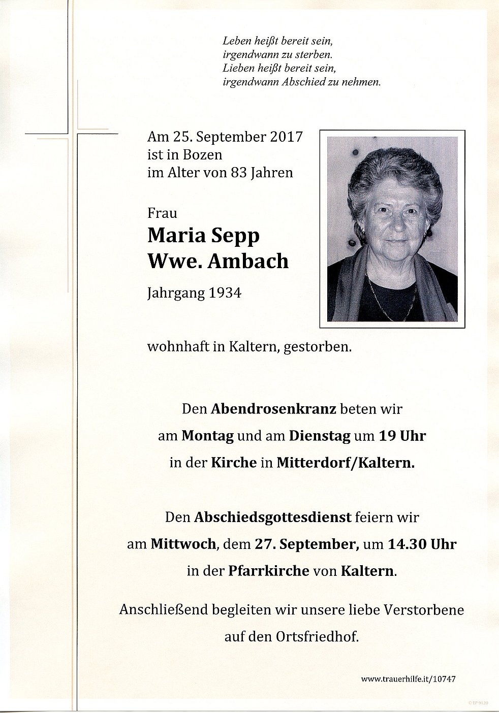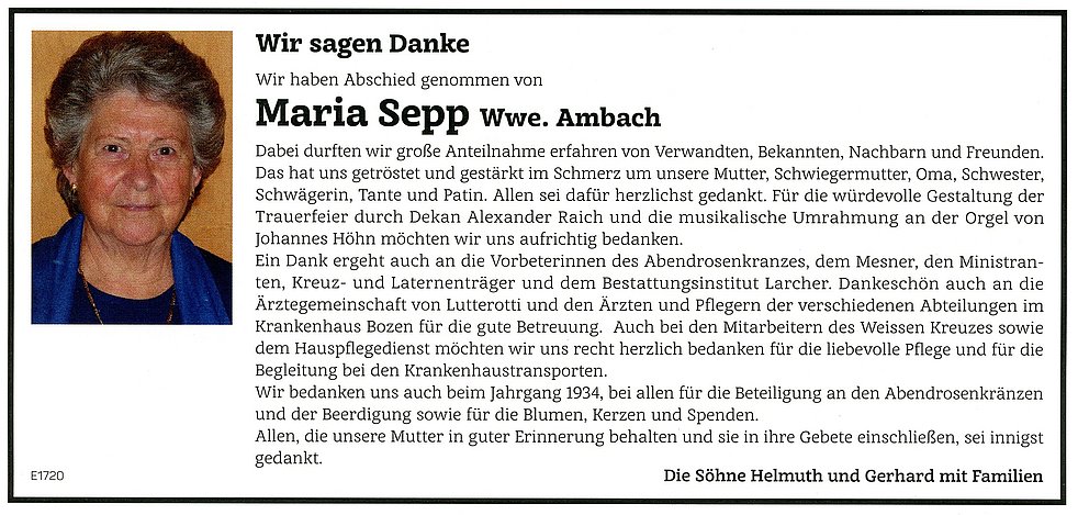 Den Abschiedsgottesdienst feiern wir am Mittwoch, dem 27. September um 14.30 Uhr in der Pfarrkirche von Kaltern. Anschließend begleiten wir unsere liebe Verstorbene auf den Ortsfriedhof.