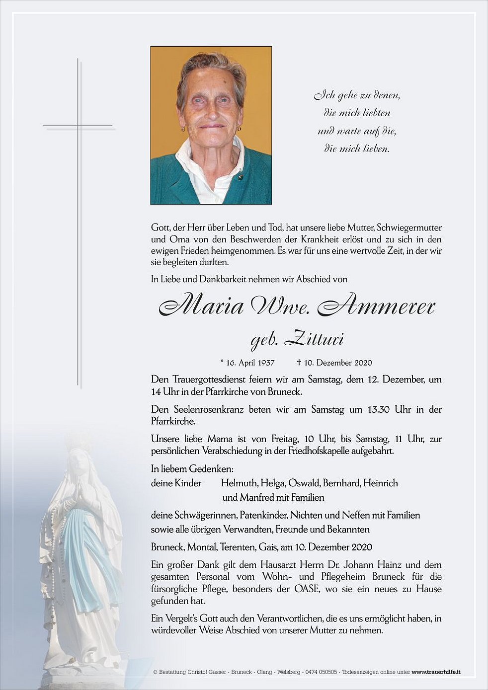 Den Trauergottesdienst feiern wir am Samstag, dem 12. Dezember, um 14 Uhr in der Pfarrkirche von Bruneck.