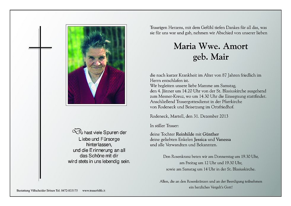 von Rodeneck und Beisetzung im Ortsfriedhof.