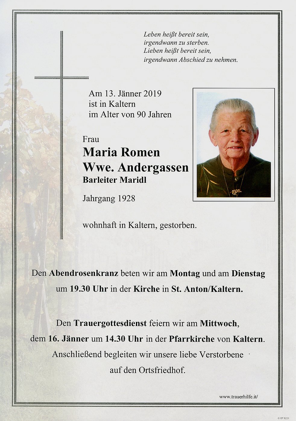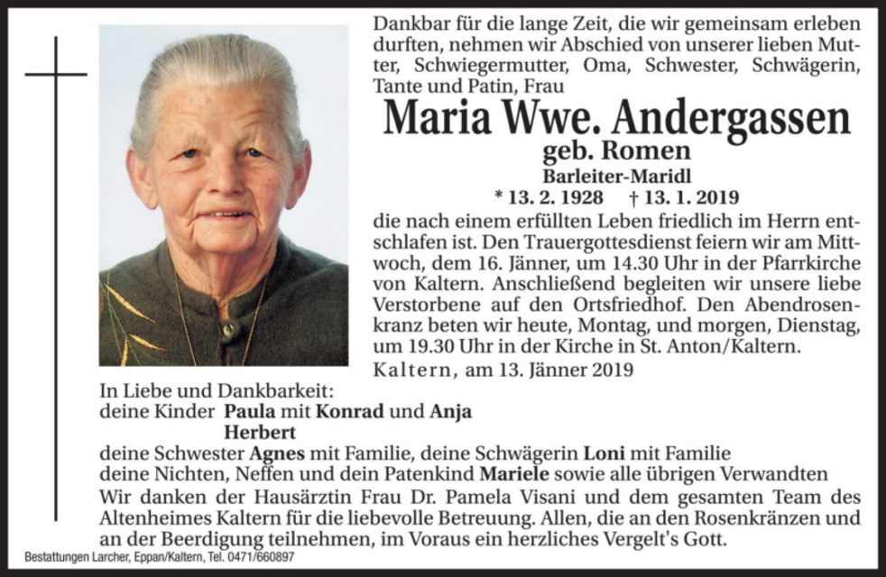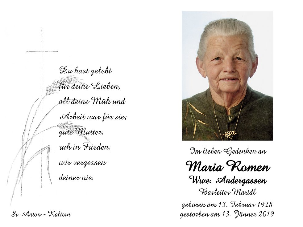 Den Trauergottesdienst feiern wir am Mittwoch, dem 16. Jänner um 14.30 Uhr in der Pfarrkirche von Kaltern. Anschließend begleiten wir unsere liebe Verstorbene auf den Ortsfriedhof.